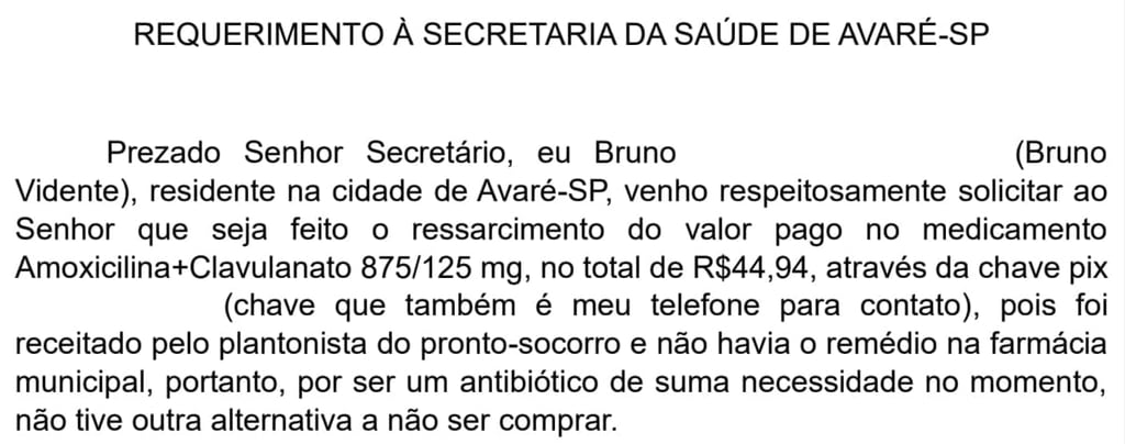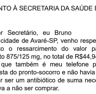 EM VISTA DISTO, O REQUERIMENTO FOI FEITO E PROTOCOLADO NA SECRETARIA DA SAÚDE DE AVARÉ, SOLICITANDO AO SECRETÁRIO QUE FAÇA O RESSARCIMENTO DO VALOR PAGO, MESMO QUE NÃO SEJA UM MEDICAMENTO DE ALTO CUSTO, AINDA ASSIM A OBRIGAÇÃO DE FORNECÊ-LO É DO MUNICÍPIO.